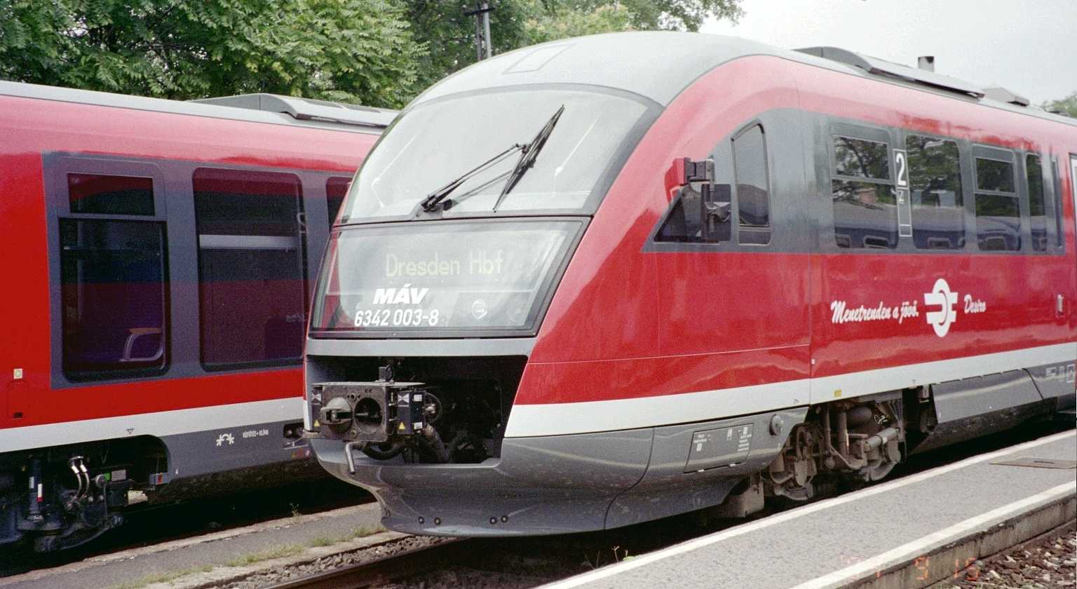 A szomszéd vágányon is Desiro áll, indulni készül, kijelzőjén a szöveg: Dresden Hbf.