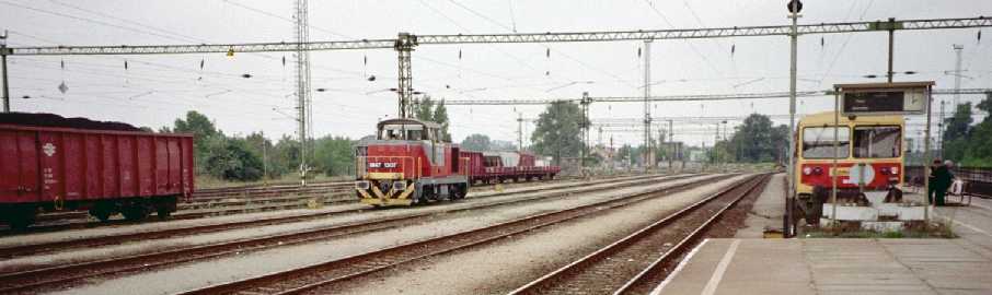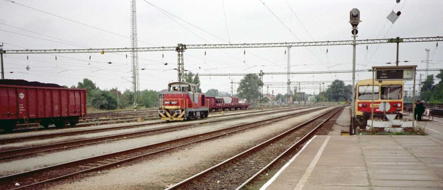 Esztergom-Kertvárosban megvárjuk a kicsit késő pesti vonatot. Azután Tokodon is állunk néhány percet, nem tudni miért. Nyergesújfalu állomáson M40 234 készül Esztergom felé üres autószállító vagonokból álló vonattal.