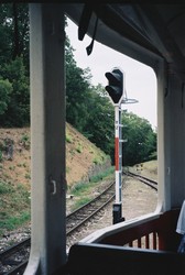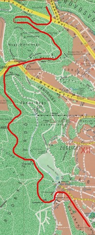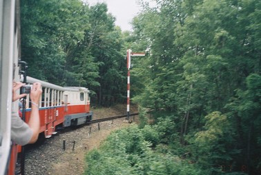 Szép vonalvezetésű pályán kanyargunk fel a Hárs-hegy oldalába. Az alagút után fentről bámulhatjuk azokat a síneket, amelyeken pár perccel korábban haladtunk. Mindenki élvezi a természet és a kisvasút szépségeit. Az alaki jelzőket már nem kezelik, folyamatosan tilosat mutatnak, amikor elhaladunk mellettünk. Ez nem tetszik nekem, talán inkább szabad állásban kéne rögzíteni őket, mint sok nagyvasúti társukat. Egyébként a fényjelzők is ki vannak kapcsolva, csak a két végállomáson és a keresztező Szépjuhászné állomáson kezelik a jelzőket.