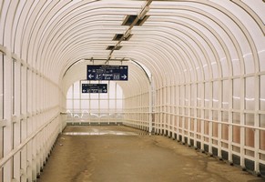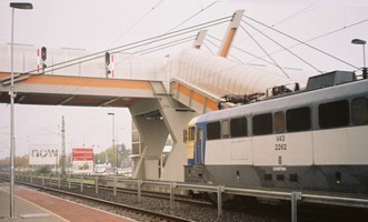 Lifttel megyek fel a vágányok és a négysávos út feletti felüljáróba. Az felüljárót kilátásmentesen építették meg, ennek két oka lehet, vagy az ostobaság, vagy a terrorizmus elleni harc. A kilátásmentesség ellenére bármibe lefogadom, hogy lezárják a felüljárót, ha kényesebb delegáció közlekedik a közúton.