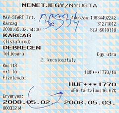 Debrecenbe érve első dolgom a Nagyállomáson megkísérelni a jegyváltást a holnapi utamra. A tervezett útvonalam sem annyira triviális, hogy benne legyen a beprogramozott kínálatban. Ám a kedves és ügyes debreceni pénztáros hölgy, pesti kolléganőjével ellentétben, veszi a fáradságot megérteni merre is akarok utazni, ezek után már nem jelent neki gondot pillanatok alatt összeállítani a másnapra szóló menetjegyemet.