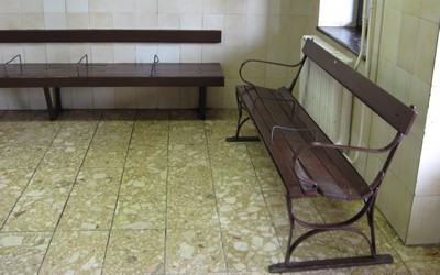 csecsemőjét szoptató anya. A szomszédos váróban ügyes szerelvényekkel oldották meg,